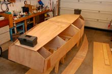 | Gravity is your friend when fitting the bilge panels and bottom. This shows how they fall towards the bulkheads instead of away as they would if you built the boat upright. |