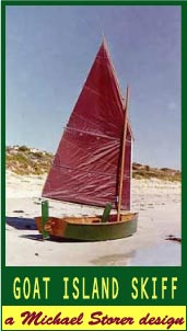 design that I really liked the looks of. For various reasons I decided not to build it and searched some more. I found Michael Storer's "Goat Island Skiff" (GIS) design and really liked the looks of it. Michael answered many of my questions via e-mail especially concerning the advantages of the balance lug rig that the GIS uses. I ordered a set of GIS Plans and spent a lot of time reading through Michael's instructions. Before I could order material I decided I wanted a boat with lots of flotation as it would be sailed with a couple of young boys aboard and I wanted the flotation. This also led to my discovery of Duckworks as the GIS plans were bought from the Duckworksbbs.com website.