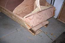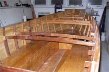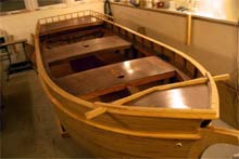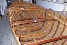 The hull is strip planked with tongue and groove planks. The planks are glued together and screwed to 14 forms attached to a strong back. |