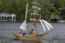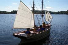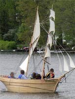 Since this picture of Little Leon, two staysails have been set between the two masts but I still have to make the fore course, the lowest square sail. We’ve had Little Leon out four times since this picture was taken but everyone who comes is in the boat so we have no new pictures! The fore course will be made this winter for the 2009 sailing season and we’ll get some pictures with her full suit of sails. One person can sail with all 7 fore-aft sails and one other person is needed to set the square sails.