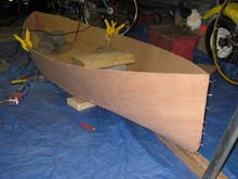 The Swamp Yankee plans are not very detailed; for example, the hull panels when stitched together try to fold-up flat. One must pry the sides out and brace them in that position. The directions read, "the boat should look right; if it doesn't look right, wiggle it around a bit until it looks right..." For the sake of stability and shallow draft, I wanted to get as shallow a "V" bottom as I could get, but since the bottom panels are vertical at bow and stern, getting them close to horizontal amidships imparts some wicked twist in the panels. I set the stitched hull on the concrete floor of the garage and began to stack bricks and concrete blocks into the hull to flatten-out the bottom. I twisted the panels as much as I dared before I locked the hull in position by taping the interior seams and glassing in a 1/4" plywood seat panel. The hull has a bit more "V" than I wanted but I feared any more twisting would have torn the panels. Although Larry used 4mm in his canoe and experienced only minor tearing of the plywood, I would not attempt to build this boat out of plywood thicker than that.