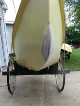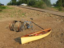 One the second trip down to the river I had an incident involving an uneven expansion joint in the pavement which lead to some damage to the bicycle, some fiberglass scraped off the stem of the canoe, and some skin scraped off me. The canoe was easy enough to repair, a bent wheel was straightened on the bike, and I pretty much healed-up although was quite sore for about a week.