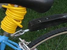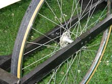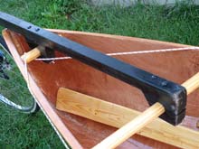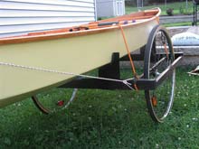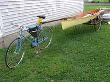 In addition to the boat, I also needed a "trailer" to tow the canoe behind a bicycle. I decided to build a "dolly' of sorts that fastened to the canoe, and a "tow bar" that clamped to the thwarts of the canoe and hitched to the seatpost of the bicycle. My trailer design borrowed heavily from some bicycle utility trailer designs which I found on the web. The 27 inch wheels came from an old Schwinn Varsity 10 speed which I had orignally purchased in order to get fenders for another old Schwinn that I use as a commuter bicycle. The frame of the dolly is wood, glued together with epoxy, while the "drop-outs", or brackets that the wheels bolt to, where fashioned out of steel covers for 4 inch electrical boxes. Since bicycle wheels are fitted with very short axles that require support on both sides of the wheel, the dolly has stringers on both sides of each wheel. Cradle supports where cut to fit the hull, padded with split plastic tubing, and screwed to the dolly frame. The supports can be replaced with other supports should the dollar be used with a different boat.