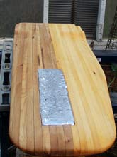 It was a pale yellow color and I wanted a rich oak/teak color, and stain would be the answer. I tried a couple of test pieces first with the scraps, and met with some success. But when I applied it to the new transom and laid down the first coat of epoxy...   ruin and torment met me. I had what’s called in painters’ circles as “fish eyes”.