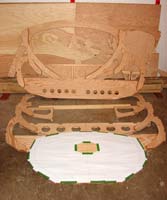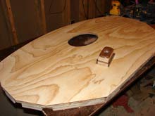 With the success of the first two frames, the other frames came quickly.  Within a couple of weeks I had made a frame kit. However I had no transom yet. I intended on having a fancy bright varnished transom so I searched many of the local lumber yards looking for that perfect piece. Nothing. I searched again another day for a nice piece that would do the job but need some work. Nothing. Finally I went to the closest lumber yard and picked up a thick piece of ply surrounded by a host of other mediocre lumber. It would have to do. It was unceremoniously brought home on the roof of my car and cut to the shape intended for a transom.