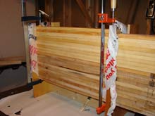 I set up a jig made from old cupboard doors (A story for another time) to hold the strips of wood in place. This would help me clamp and align the pieces better. The strips were coated on one side and placed in the jig. Once all the strips were in, I lightly clamped the whole thing until the glue set. The same procedure was used for the rudder blade.