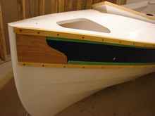 The screw holes were plugged with oak plugs as a contrast to the lighter color gunwales.