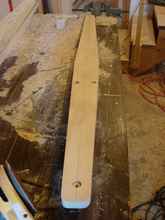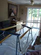 Everything including the transom was sanded and given several coats of spar varnish. Remember when I mentioned doing as much as I could in one shot, well I took this to perhaps a dangerous level. You see my wife and daughter were out of town for the week and I used this opportunity to open “site #2”. My living room/dining room was converted into a workshop for varnishing my mast, boom, gaff and rudder blade.