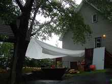 I found some used plastic to place under the sled to make it slide easier on the concrete floor and it worked very well. With everything in place and ready to go, it began to rain, naturally.