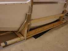 I made a sled with plastic runners that will carry the boat outside. Straps were added to keep it all together. My friends came to help with the move, but before that I had to make some space. I had to remove the shop door inside the house and the post next to it. I supported the house above with a steel beam and a rented jacking post.
