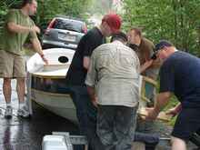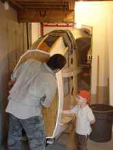 My friends’ son Nathan was on hand for supervision and safety. He gave me helpful advice as we pulled the boat through the basement.