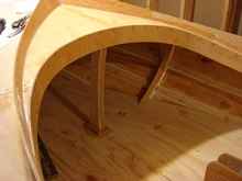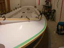 The painting now done, I spliced and steamed the gunwales and coaming trim. They were clamped and screwed in place until it dried out for a few days. They were removed and several coats of varnish applied to the back sides before final installation. All were screwed in place with adhesive caulking as a sealer.