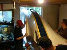 It was basically a two person job, but, with all the bodies around, moving the pieces, sliding plastic and checking for space meant it took little time to move it.