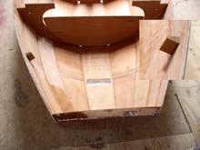 Tilted jig after attaching the 4th hull plank on both sides. |
