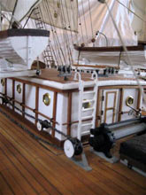 | Stern detail including the taffrail around the poop, steering wheel and stern carvings. Note `in and out' strakes of hull plating. |