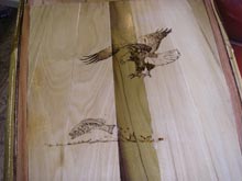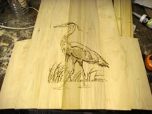 I added artwork to this one by wood-burning images to the front and aft decks. This is not that difficult to do and doesn’t take as much time as one would imagine. You can find you favorite picture, print it out in black and white if it’s a color photo. For the one on the front deck I increased the size to the point it had to be printed out on four sheets of paper. You “tape” down your image over a sheet of graphite paper, then trace and rub the image on the wood. I used a green “grease” pencil to keep up with where I’ve been. This leaves a faint “sketch” of the image you can burn directly over.