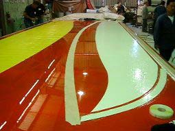Picture of table surface (red), gel coat (white), and hull panel pattern (yellow).