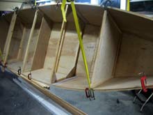 The initial design wish list was long, but first was the method of construction and assembly. Fortunately, since the original 'Toter' was designed, I have developed the 'Tape & Glue' method of holding all the pieces together, to produce a watertight and lightweight assembly. Of course, the new 'Toter 2' will use this process. Then came the decision as to how the 3 hull modules would be fastened together. Here too, past portable boat designs helped in the decision process. My favorite method is the use of dovetail connectors, but builder feedback has indicated it is too difficult to produce and fit. This left the bolt together method, and results from my 'Pollywog' design/build showed that even a larger boat could be safely bolted together. Placing 3/8 inch bolts on the center of the side panels, at the bulkheads, would ensure a strong and tight assembly. This is the same method most recently used in my 'Kayak+' design, and it works quite well. Easy to set-up, and easy to dismantle.