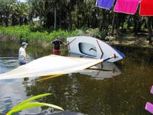 One more 'Toter' thing. Some people have inquired about adding a sail to the 'Toter' design. I have responded by saying the hull was too narrow, and there would be stability problems. With 'Toter 2' that is no longer an issue, as the base is wider and the sides are more generously sloped. So I will be designing a sail rig, similar to the 'Pollywog', just as soon as time permits. Not much different than a PDRacer, really, but a truly portable design.