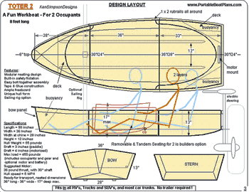 My original design in this area was the 'Toter'. It has good performance, is lightweight, inexpensive to build, but only holds a single occupant, and requires modification to a trolling motor. After much thought, some feedback, and a few other larger boat designs, I have come back and revised the basic configuration of the 'Toter'. The new 'Toter 2' is the result, and although no longer than the original (8 feet), it holds two occupants in tandem, is wider, has more freeboard, has built-in safety buoyancy, can carry up to 450 pounds, uses a non-modified electric trolling motor for propulsion, and best of all, it looks like a boat. As with the original, when nested, it occupies an area only 3 feet square, and 17 inches high. It will fit in most car trunks, and all RV's, SUV's and Trucks. No trailering or cartopping !