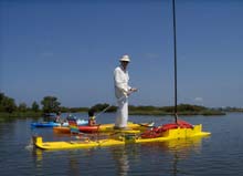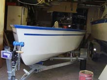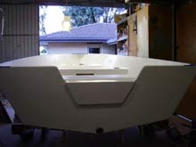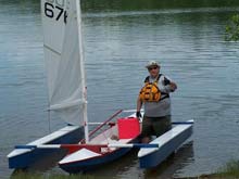 The photo of Jim Renouf stepping into Eden was his 1st moment afloat in her. Ron Sell photo'd. Her sheer strake is still carbon showing, but will get painted to contrast w/ the whitish below & kevlar tape above, probably a medium intensity violet. I'm arguing to metal flake it, since I had instructions in FL from a Harley painter on how to low tech flake. Probably Jim won't go for it, though.