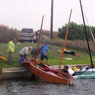 Jim Renouf launched his Bufflehead, "Eden" It was a rush time for us once we got there since K & I'd driven down w/ my dad---1st year he'd not driven himself. He's 88---so I didn't get to sail Eden or try the new rig.