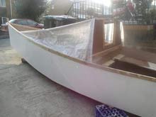 I have finished the inside and have rolled her over and started on the outside. Hopefully will prime Saturday. I am happy with my efforts thus far. Got my oars last week and am itching to get on the water but am attempting all the calls in my head to hurry. I ordered my oars from Van Fancy of Fancyoars-paddles.com Very nice man and he makes and has been making oars for a long time. Great prices too. Fast? well he is very fast. Makes oars as they are ordered appearently. I got one pair of spoons and one pair of straights for the price of a pair of S&T's.. I have put up new photos of my progress in the photo section. Whatcha think?