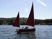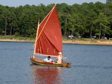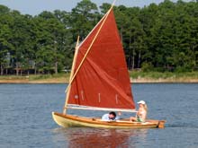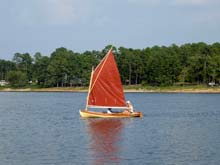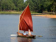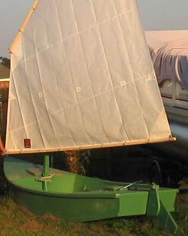 Sorry I don't have a better photo but it does show the genuine Duckworks Sail. I wasn't brave enough to sew my own sail. The boat is a lot of fun and operates very well. Jim Michalak's book made it very easy to build.