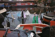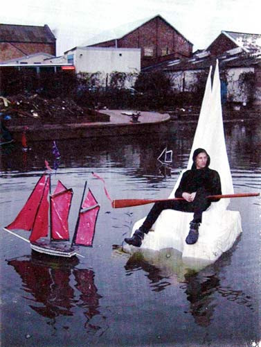 He even built a floating armchair which he is seen in on the Lee River in East London in 2001. He used to paddle down the canal, on occasions in snow squalls collecting boats of the Saggimau fleet that got stuck in the over-hanging trees. (Saggimau was the mythical land he invented in which the boats of the fleet happily lived and sailed). The red sail boat is Ferocious Fred.