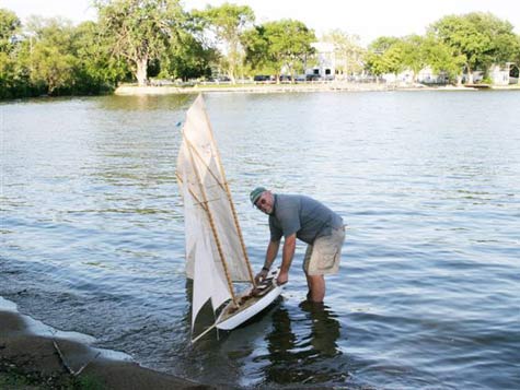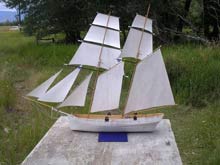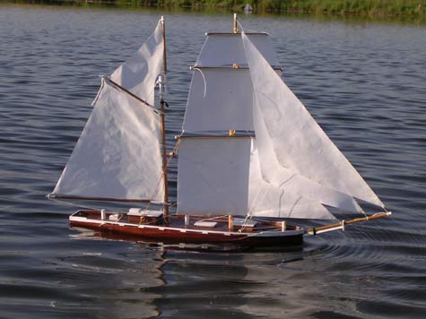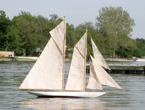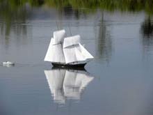 In the photograph immediately above is the schooner with the smaller sail and in both photos she is towing a Styrofoam whaleboat as a marker buoy with twenty feet of kite string on a spool in case the model should ever sink.
