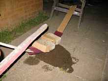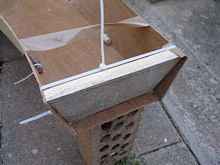 The end panels were cut from an old plank I had lying around. It was 4 inches wide so I was able to add a little inward slope to the ends. Note the usefulness of cable ties demonstrated yet again. The end pieces are 6 inches across the bottom and 8 inches across the top and a bit of an angle was planed into the bottom and top edges to minimize the amount of filling required. All wood gluing was done using Vise Supergrip, a foamy polyurethane glue similar to gorilla glue. The angle of the sides in the middle was adjusted so the top of the boat was relatively level (very little rocker). I finished up with a top middle measurement of 21 and a half inches (550 mm) The sides were then glued to the floor using fibreglass drywall tape and Bostik Gold. First I did tack joins with a bit of the glue and a short bit of drywall tape in the spaces between the cable ties. After waiting for the glue to set, I removed the cable ties cut some more tape in half lengthways - two layers of this half width tape and one of full width inside and out. I started by spreading the glue with a Popsicle stick and switched to a proper putty knife about halfway through when it broke the putty knife was much easier. I used two 380gm cartridges of glue.