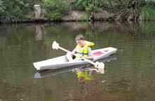 Stainless steel metal work screws were used for any permanent screwing (Keel piece, thwarts, side panels, back rest and ends). The addition of a skeg (a directional fin) to improve tracking (staying on line) might be on the agenda as the Ollie Punt is very good at turning, which makes it a little harder to travel in a straight line. Perhaps one shaped like the exhaust from a rocket engine, or a dragon tail with a matching head as a bow ornament, or a fake outboard motor profile, you could even make it a boring triangle of wood if you like. All it has to be is vertical surface area as far from the center as possible, you can even put them at the front, or a couple of parallel ones right at the back a little way apart like they have on surf boards. However, you don't need to travel in a straight line to have fun on the water. Indeed you don't even need to stay upright, you just finish up having fun in the water too (temperature permitting).