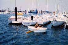 California 90266. In the taped seam construction method used, the plywood hull panels are held together with short lengths (3" to 4") of #20 gauge copper wire inserted from the inside of the hull through pairs of holes drilled along the chines.
