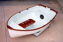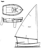 Pepita was designed as a small yacht tender which would row, tow, stow, sail and even power well. She is sized to fit on the foredeck of a 27 foot sailboat between the mast and bow cleat. She is constructed of marine plywood using the taped seam construction method. The entire structure is saturated with epoxy resin. The outer skin is 4 oz. glass cloth. The sides are 4 mm mahogany plywood, while the bottom and interior parts are 1/4 inch fir plywood. Only two sheets of plywood are required. The boat is trimmed with solid mahogany. The sheer rail is laminated mahogany and spruce.