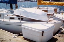 The hull shape makes the boat a good "sea boat". She handles rough conditions very well for its size. The flip side is that (in the original version) the boat is tender and care must be exercised when entering or exiting. The original owner insisted on enough floatation that the boat could be rowed out through small beach surf even if swamped. Once outside the surf line, the boat can be bailed and rowed out to the anchored yacht. With cooperation from a buddy, it is possible to climb into the boat after snorkeling. With these characteristics, the boat might if called upon serve as a lifeboat.