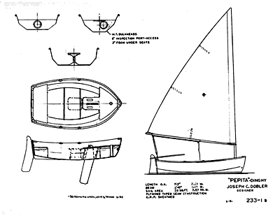 Pepita is a lightweight, 7'3" dinghy with a 3' l0“ beam designed by loseph C. Dobler. |