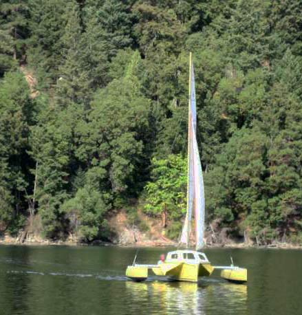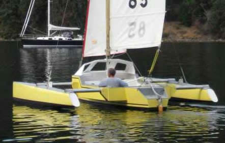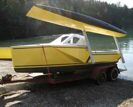 For trailering the outrigger hulls fold up. Because they are beach cat hulls they are very light (around 40kgs, under 100lbs) and so it is easy to do. The centre of gravity is still relatively low so no problems when driving. Trailering beam is under 8ft.