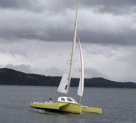 The 18ft STRIKE is a trimaran design that uses a 16ft beach cat as the outriggers/amas and rig. The main hull is plywood and has a dory shape that is extremely easy to build. The cabin top is removable to convert a fast day sailing boat that sits six in dry comfort into a simple pocket cruiser that sleeps two.
