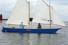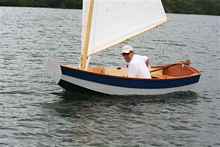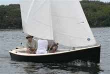 Allen and Judy Boyes in their modified John Gardner designed “Fat Boat” based on a Swampscott Dory.