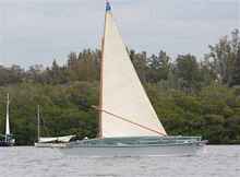 Fiberglass reproduction of a Gil Smith Long Island Catboat by Legnos owned by Ron Gryn.