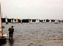 Steven did make a great showing since he's new to this sailing stuff. The big boats (over 20 feet ) put on a good show. Howard's "Tricia Marie" edged out Bob Bloomquest in the schooner "Scoona"but I gave it to Bob because he's a yankee sailor and not used to the shallow water. Every time he was about to pass us he knifed his dagger board into the mud. We had fun laughing at him but he really was faster than us in these conditions.