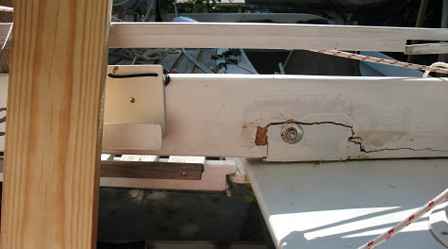 Dean in Honu got tired of bashing into the chop and turned back to Sand Island. I should have followed his example, especially since I’d discovered a patch of rot in my rear crossbeam a couple days previously and the repair had not held up to the constant crashing through the big chop. But the boat was holding together, despite the fact that one bolt on the beam had broken out completely, so I pressed on, and eventually arrived in Navarre. The damage was pretty bad, as can be seen in this photo.