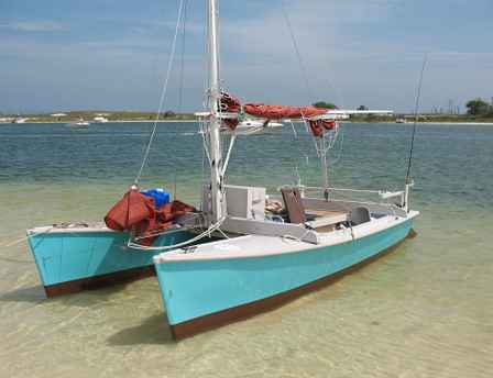 Dean really put a lot of thought into Honu. I wish I’d taken more pictures. For example, as an experienced waterman, he’d painted his decks and interior an eye-pleasing gray, which cuts down tremendously on the glare. He’d built a really well-organized chuck box, with an easily accessible place for everything. He’d built little drawers under his seats, so that snacks and other needed items were easily to hand. He had a very good system for supporting his mast and boom when they were down for trailering. Later back at Pirate’s Cove, he showed me his trailer, which had begun life as a narrow johnboat trailer. This allowed Honu’s hulls to be outside the wheels, so that she could be a lot closer to the ground than Slider is on her trailer. Consequently, he can use just about any ramp, and Slider has to find a fairly steep deep one.