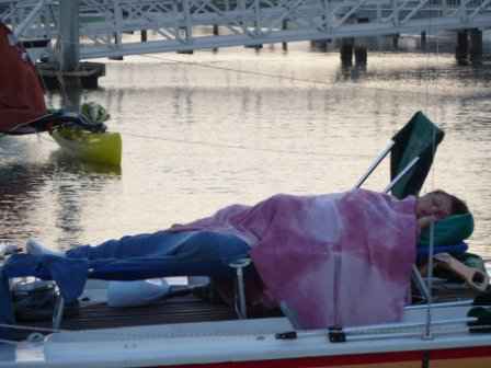 I spent a peaceful Friday night at Navarre, pulled up on the beach. I was too tired to pitch the deck tent, so I just snoozed on a cot set up on deck. I’m told that I slept like a baby, if babies snored like buzz saws.
