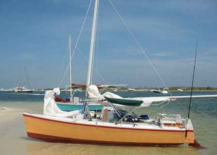 One of the big surprises to me was that Slider was faster to windward, by a large margin, than the two Windrider 17s in the event. I’d never have guessed that this would be the case, even though I like to brag about Slider’s windward ability. One left the previous anchorage before I did, and I passed him a few miles before reaching Navarre. At this point, the chop was lying down, and the course became a close reach. I expected the Windrider to pass me then, but if anything, we increased our lead. The Windrider 17 is a rotomolded plastic trimaran with a modern fractional rig, complete with rotating mast, designed by the great trimaran designer Jim Brown. I found it completely amazing that Slider, with her greater weight and low-tech sprit-sloop rig, was so much faster getting to weather.