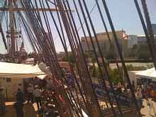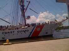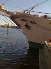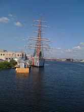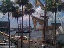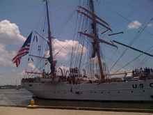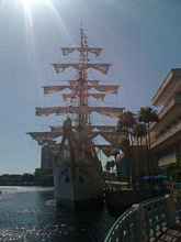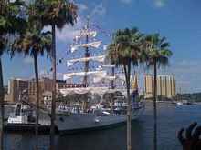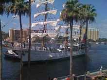 Kathie and I trekked down to Tampa Saturday to watch the Tall Ships arrive. There were 2 steel hulled 3 masted square riggers and a 3 masted staysail schooner. They were, the Gloria hailing from Columbia which made a grand entrance into the harbor. The USCG Barque Eagle was preceded by a Tampa fireboat with water cannons spraying huge plumes of water. The Eagle came into the bay, turned around and proceeded around Harbor Island to moor 2 fixed bridges away. While they were docking we missed the Captain Miranda from Uruguay arrive. We did tour the Eagle after watching the Coasties dock, lower gangplanks, raise flags, clean and ready the ship for visitors. They allowed family members of the crew to tour the ship first. It was an educational and inspiring experience.
