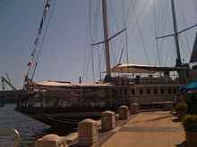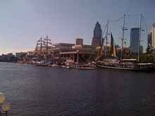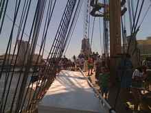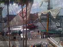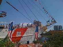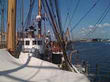 The USCG Barque Eagle enters the harbor, turns with assistance from the tugs and goes around the island to tie up a few blocks away to the left of this picture. There were 2 fixed bridges between the Gloria and the Eagle.
