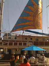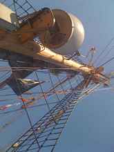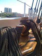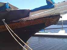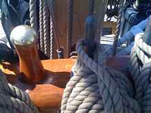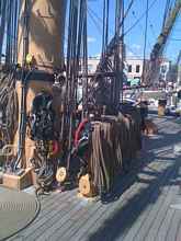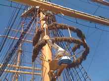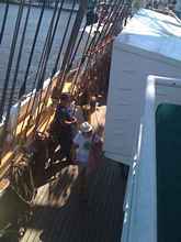 Bosun's chair hanging below the Eagle, they were started painting right after they docked.