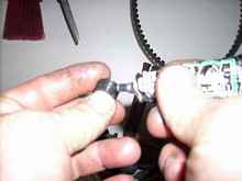 First, lets start with a little safety. Safety glassed are always a must and gloves would be a good idea also. Clamp your motor to a stable work station. A saw horse will do nicely and you could even leave it clamped to the boat, but would be easier on a saw horse. Remove the motor cover. Remove the plug. Carefully turn the flywheel so that the piston for the cylinder you are working on is at the bottom of it's stroke. Now take the tap/threading tool and find your 3/8 ratchet to drive the tool. Now apply a light coat of grease to the recessed grooves, this is to help catch the aluminum shavings you are about to create.