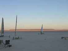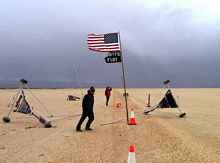 The days alternated between big winds and nearly no wind, with the light air days providing ample opportunity to stroll up and down the line, kicking tires and bullshitting with the owners (and often builders) of these intriguing machines. A fabulous group of guys and gals, ever willing to share sailing and technical tips, and encourage the newbie. A puff would come through, and the desperate among us would push our craft onto the playa as fast as we could run, jump aboard, and milk the zephyr for all it was worth, and then ignominiously drag the boat back to the edge when it fizzled, break open another beer, and resume the discussions.
